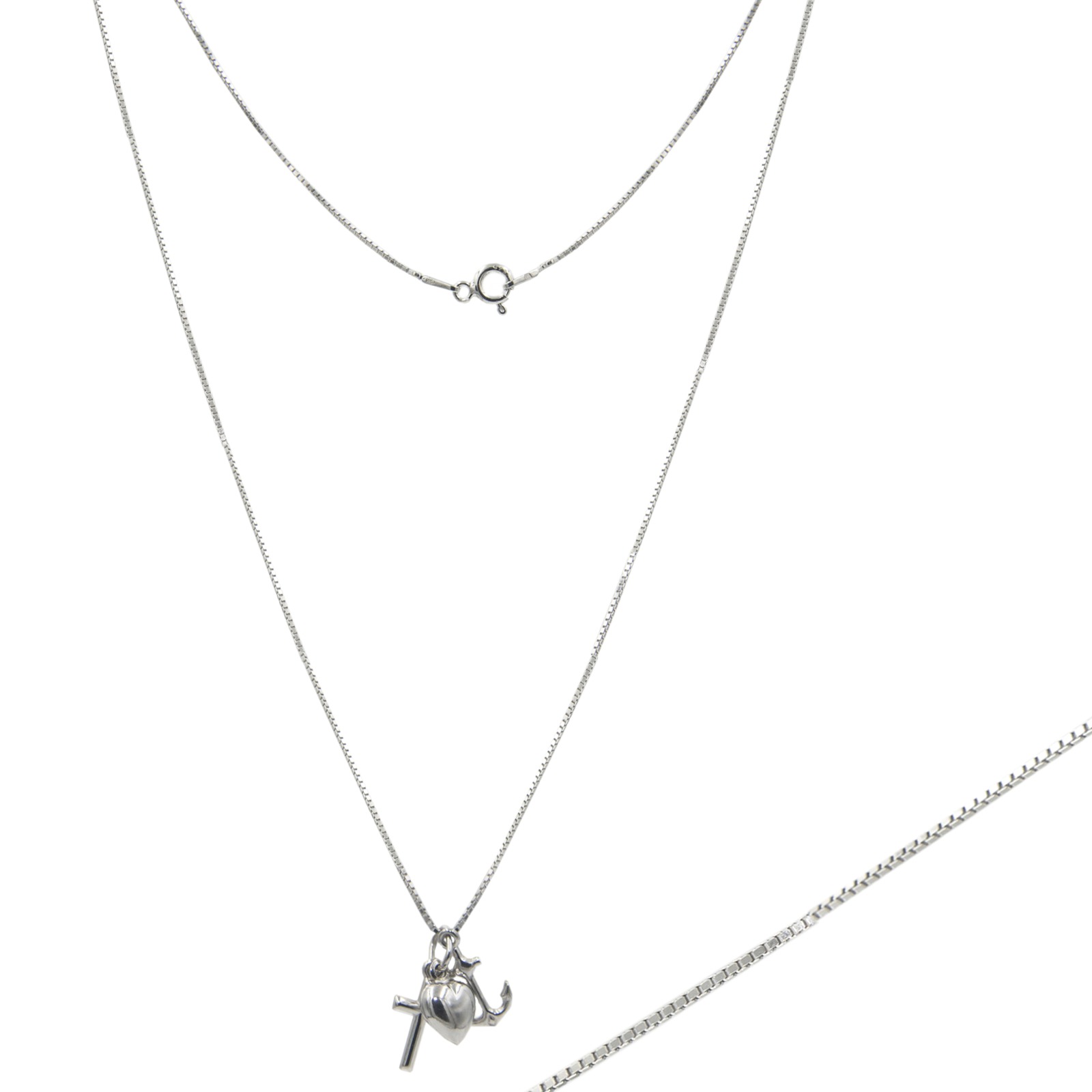 SREBRNY KOMPLET SKŁADAJĄCY SIĘ Z ŁAŃCUSZKA SPLOT KOSTKA I WISIORKA WIARA, NADZIEJA, MIŁOŚĆ