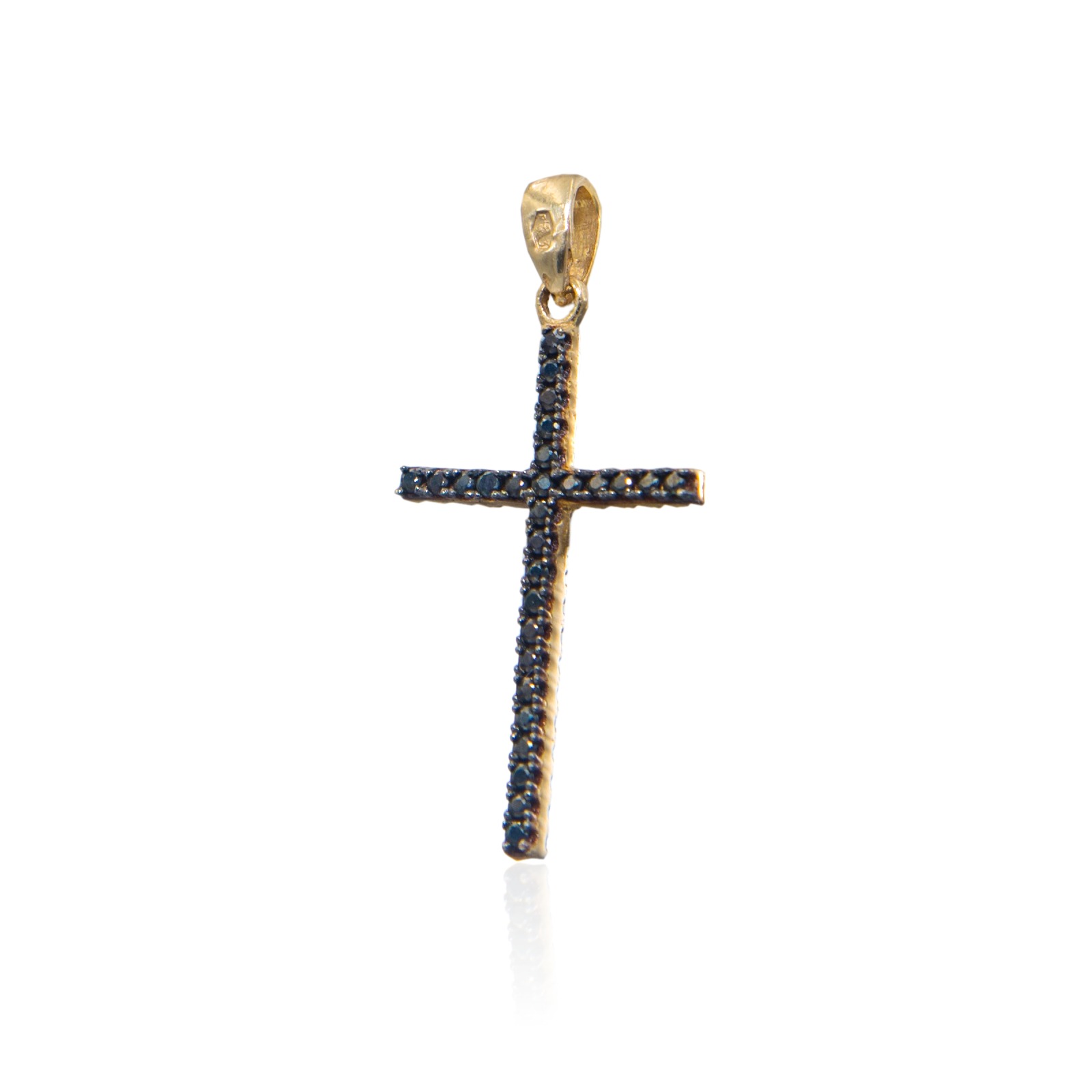 ZŁOTY DWUSTRONNY KRZYŻYK Z CYRKONIAMI I ONYKSAMI WYKONANY Z ŻÓŁTEGO