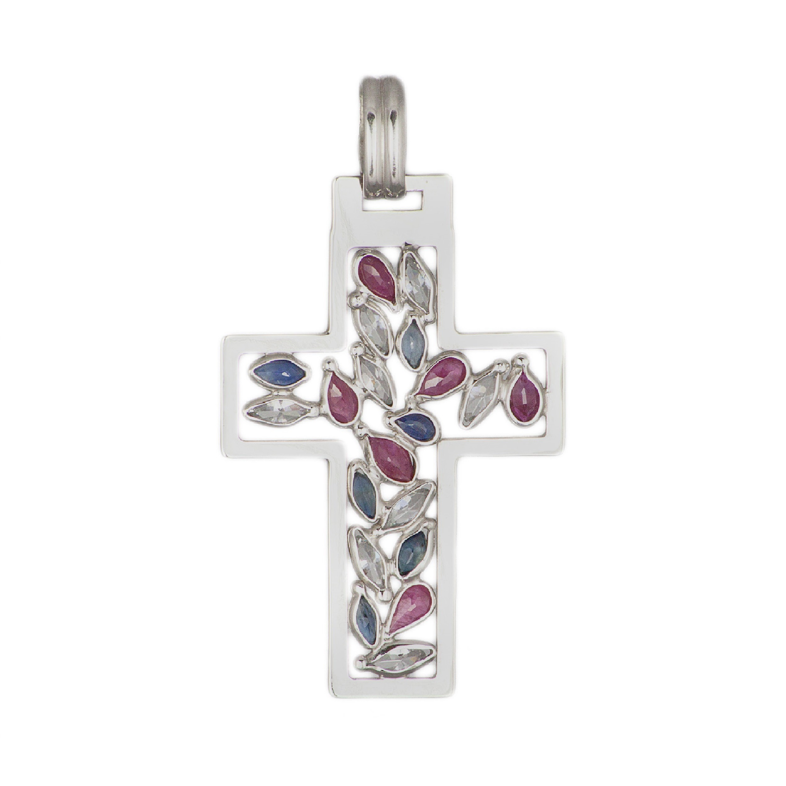 OKAZAŁY KRZYŻ WYKONANY Z BIAŁEGO ZŁOTA Z NATURALNYMI KAMIENIAMI