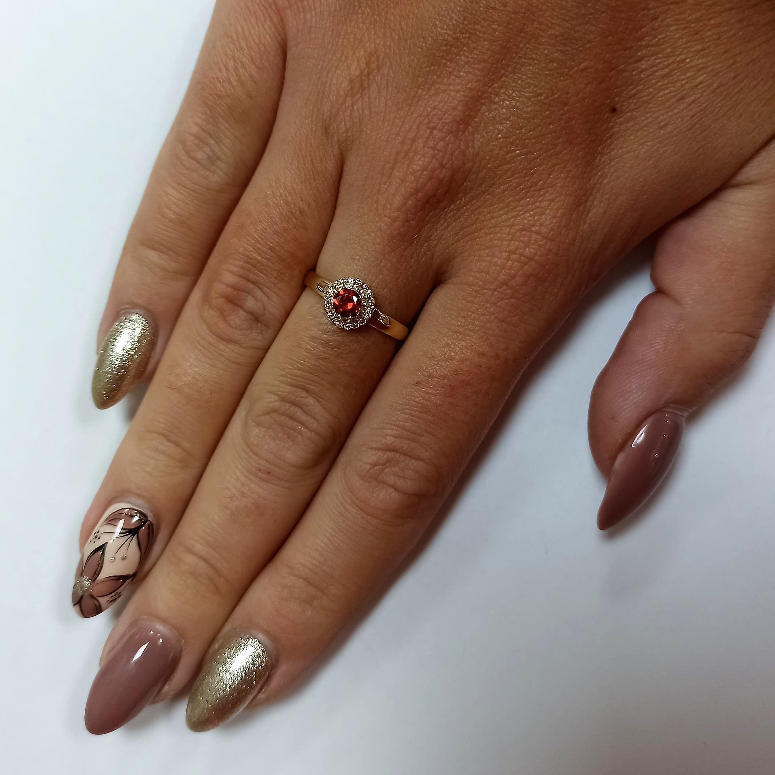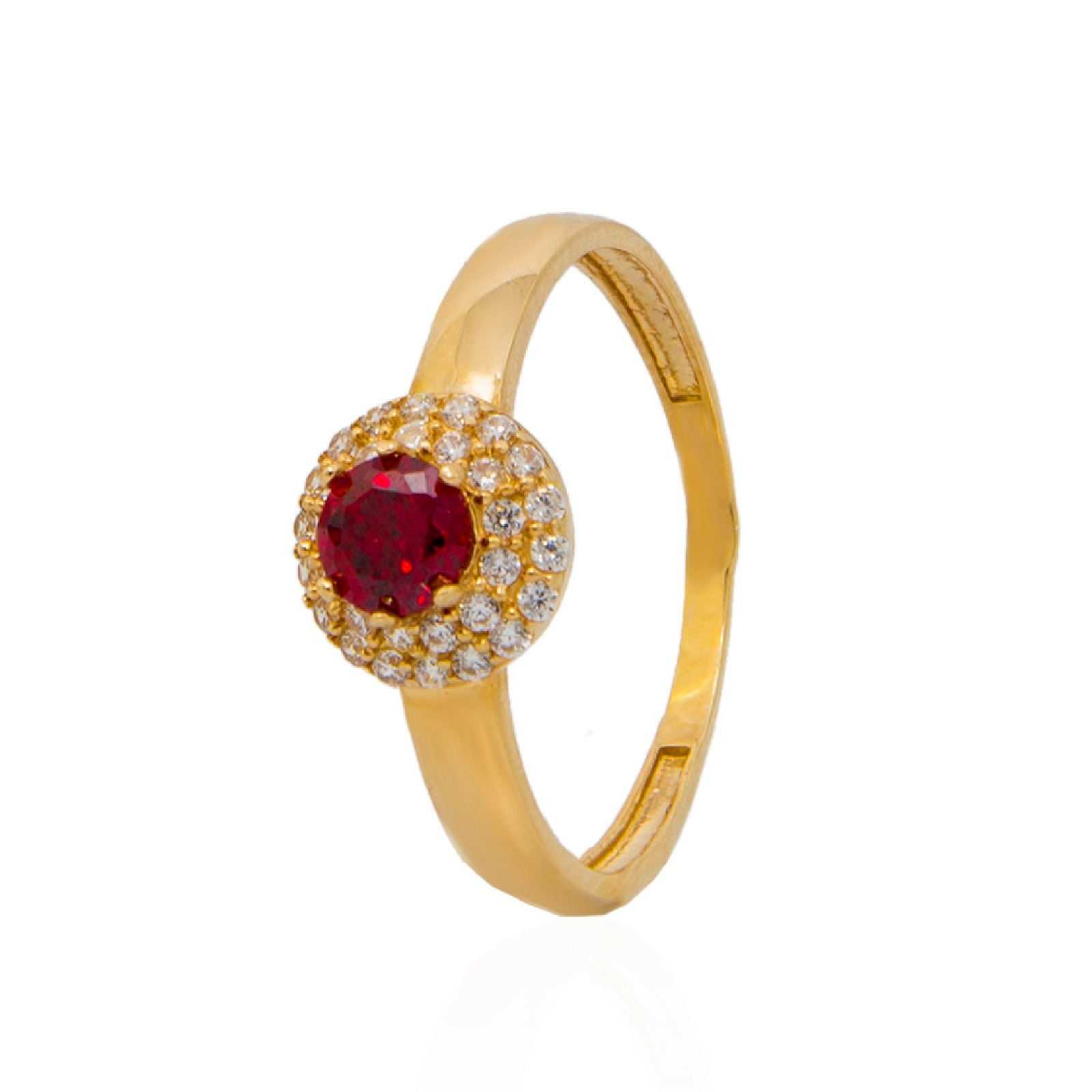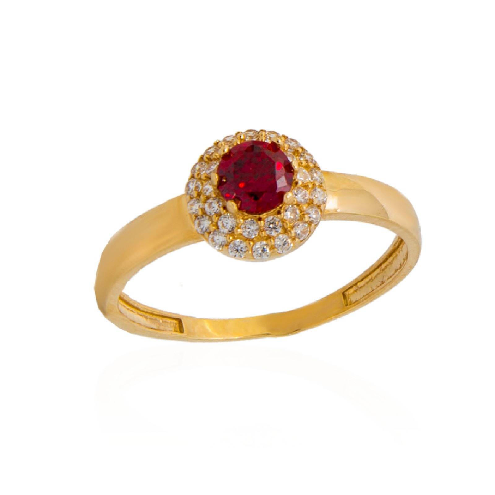 ZARĘCZYNOWY PIERŚCIONEK Z ŻÓŁTEGO ZŁOTA Z GRANATEM I CYRKONIAMI